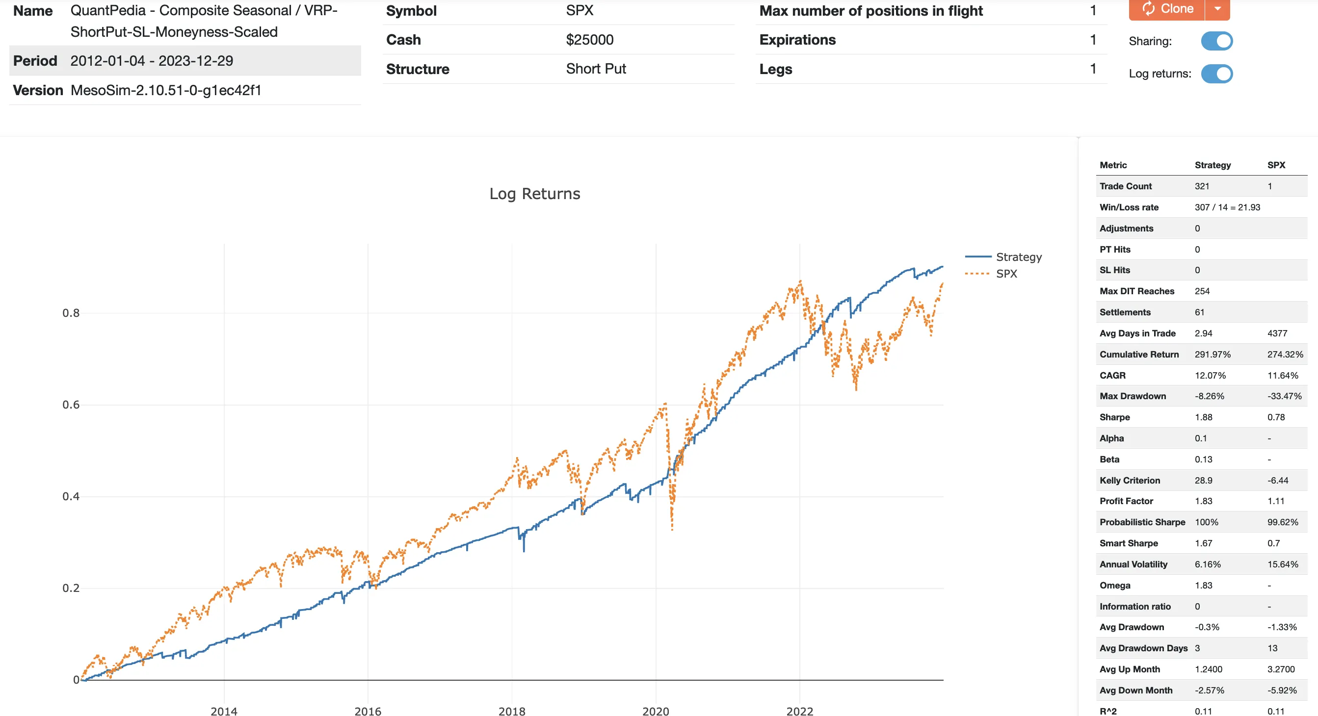 As the QCSI provides a bullish signal, we sell Puts at 10 Delta when the signal fires. We implement Stop-Loss trigger by comparing the selected contract's price with the underlying: the position is closed when the contract becomes In The Money (ITM).